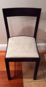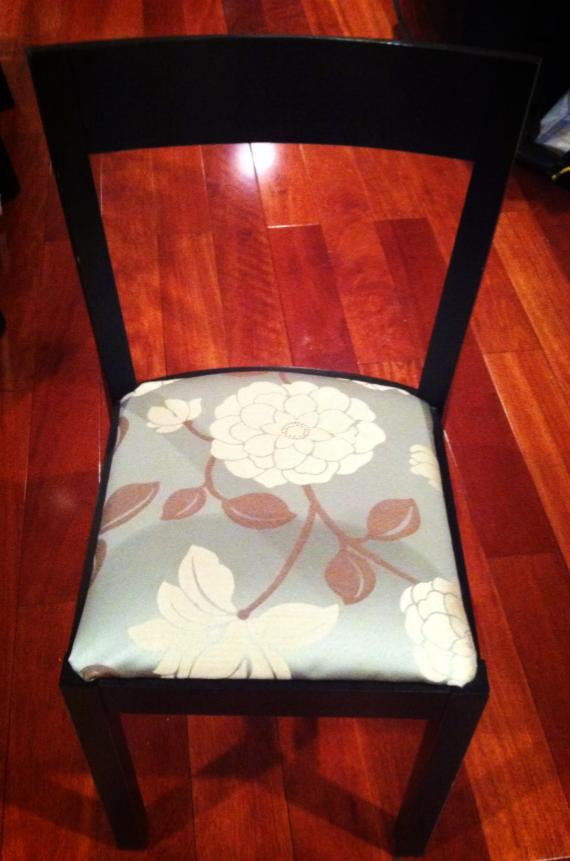 Back in my spacious Connecticut apartment, I bought four “Roger” chairs for about $60 each from Ikea to fit a small dining table I had. My parents, who live in Rhode Island, were able to store them until I bought my house in Philadelphia. The new house had an area for a larger dining table I was looking on the Ikea website a few additional Roger chairs. They had been discontinued. I turned to my favorite site, (this was before Pinterest!) CraigsList, and was searching for Roger chairs. I stumbled across a listing for four chairs plus the matching dining table for $100! It was in NY near the NJ line, but my parents were driving through that area the next day on their way to visit me and were able to pick them up. It worked out fantastically! Until a few years later when I was bored with the look of the chairs. Since I had assembled them in the first place, I knew it would be really easy to switch the fabric, especially if I cheated and just covered over the old fabric. A few screws, some fabric, and a staple gun and I was all set! I had some extra leftover fabric so I looked up no-sew valances on Pinterest and found few easy steps on blogs. Here are the results: