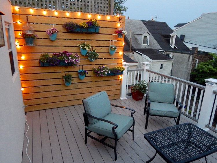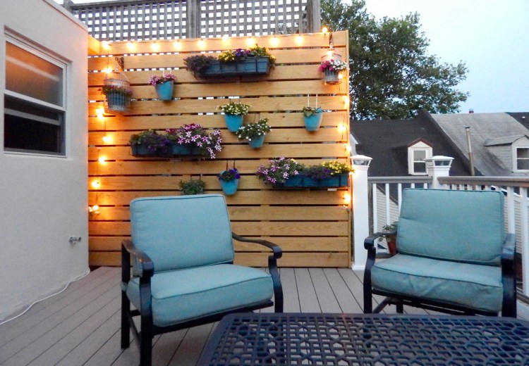 I sketched out a photoshop file of what I wanted for a privacy wall to hide the eyesore next door (see image in gallery) and my contractor was able to build it for us. I then bought some planter holders and planters from Amazon and at a local Target and filled them with plants from Lowes. Its now my favorite spot in/on the house for morning coffee, hanging out with Rylee, reading, and having after dinner drinks with my husband. Last week we ordered a pizza and enjoyed it on the roof for some starlight outdoor dining.